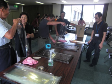 そして後半は実技。 飛散防止フイルム貼りの体験と、家具固定金物の取り付け等を行いました。